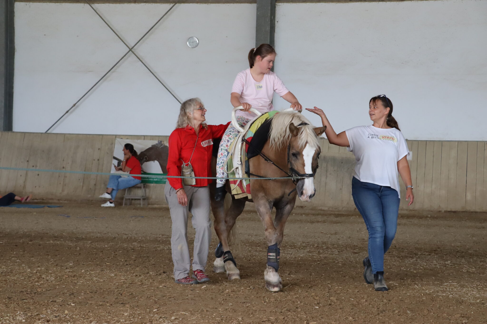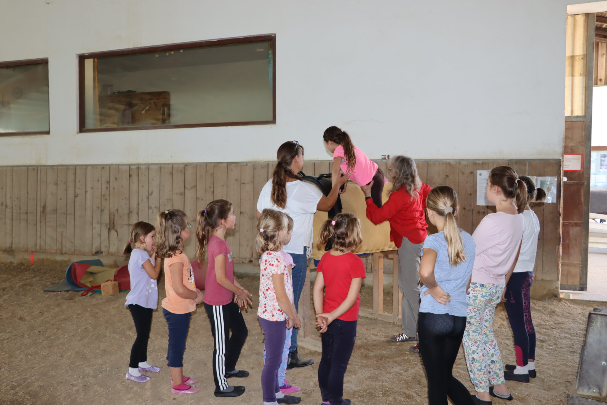 Unter der Anleitung von Trainerin Barbara Gleich, die sowohl Trainerin C Voltigieren als auch Trainerin C Behindertensport ist, erlebten die Kinder einen abwechslungsreichen Nachmittag. Während Trainerin Marie sich um Haflinger Leo kümmerte und ihn zu longieren begann, durften sich die Kinder mit Trainerinnen Barbara und Kerstin aufwärmen und erste Übungen auf dem Holzpferd ausprobieren. Mit ihrer herzlichen Art nahm das eingespielte Team schon bald allen die erste Scheu und weckte recht schnell die Begeisterung am Voltigieren.