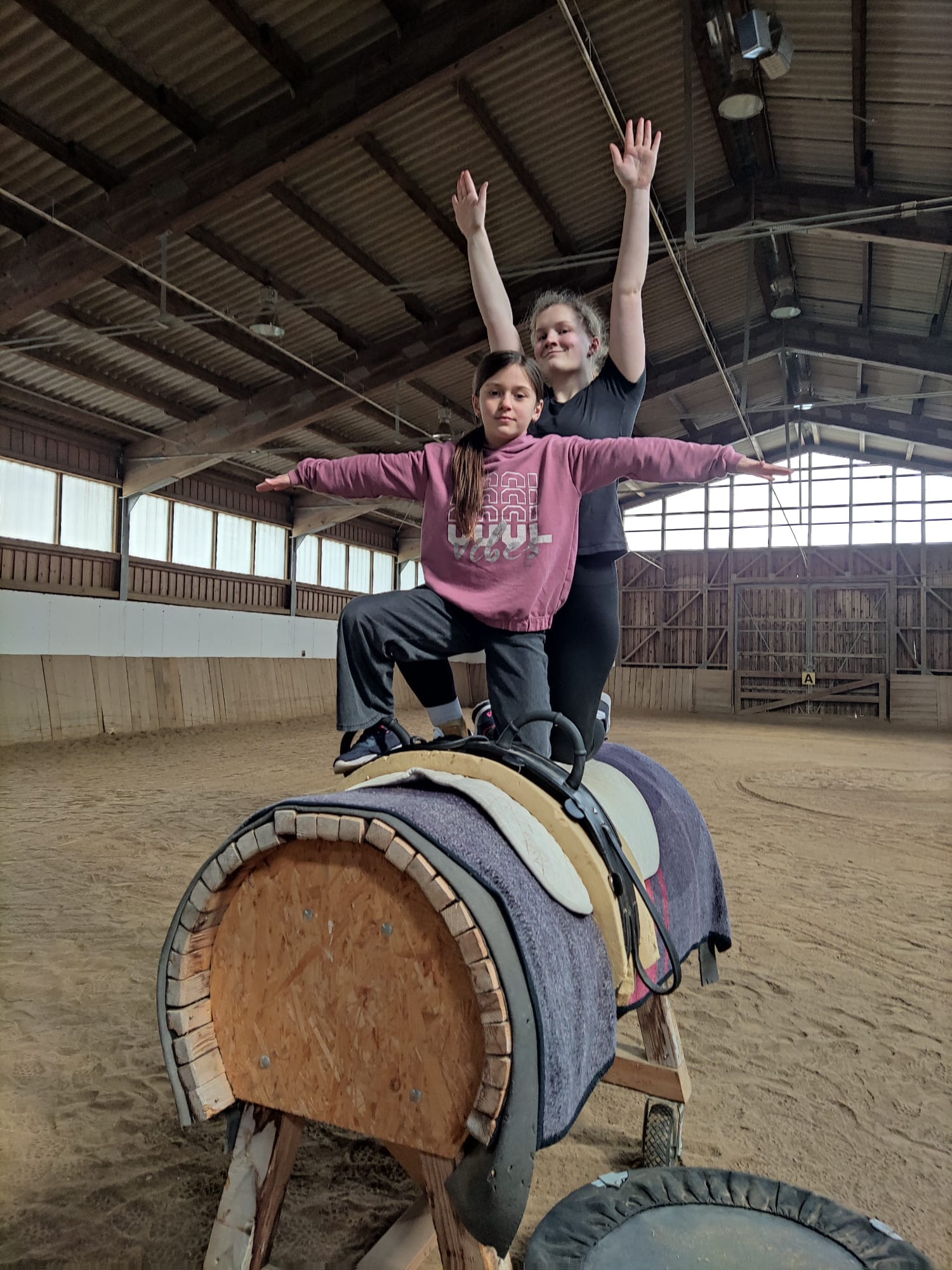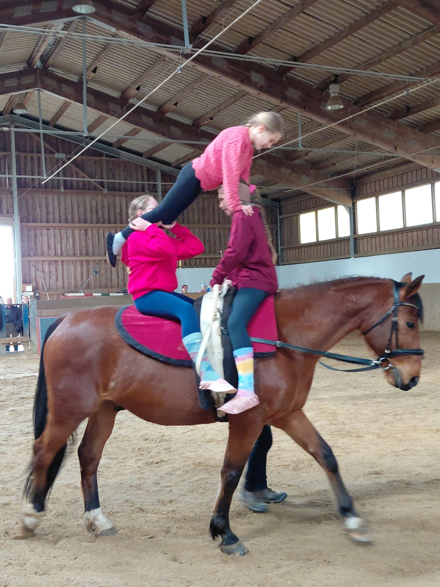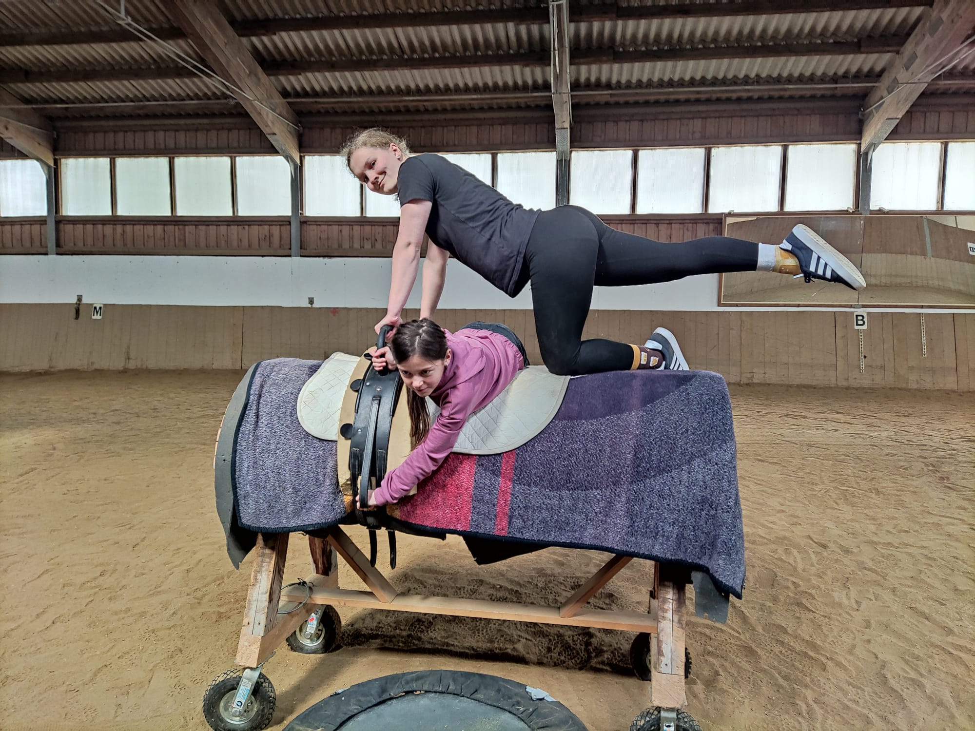 Am ersten Tag wurden die Kinder von Monika Bauer – ehemalige Voltigierbeauftragte des Pferdesportverbandes Niederbayern-Oberpfalz – und ihrer Tochter Magdalena auf dem Holzpferd intensiv trainiert und auf das Turnen auf einem lebendigen Pferd vorbereitet.