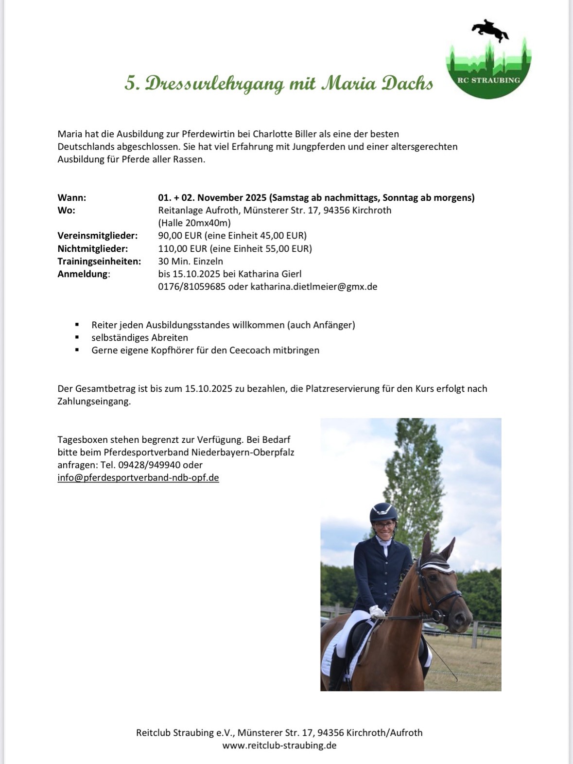 « Alle Veranstaltungen Dressurkurs beim RC Straubing e. V. 1. November 2025 - 2. November 2025 « Leonhardiritt am 26.10.2025 Reit- und Longierabzeichenlehrgang » + Google Kalender+ Zu iCalendar hinzufügen Details Beginn: 1. November 2025 Ende: 2. November 2025 Kategorien: Allgemein, Lehrgang Veranstaltungsort RC Straubing e. V.