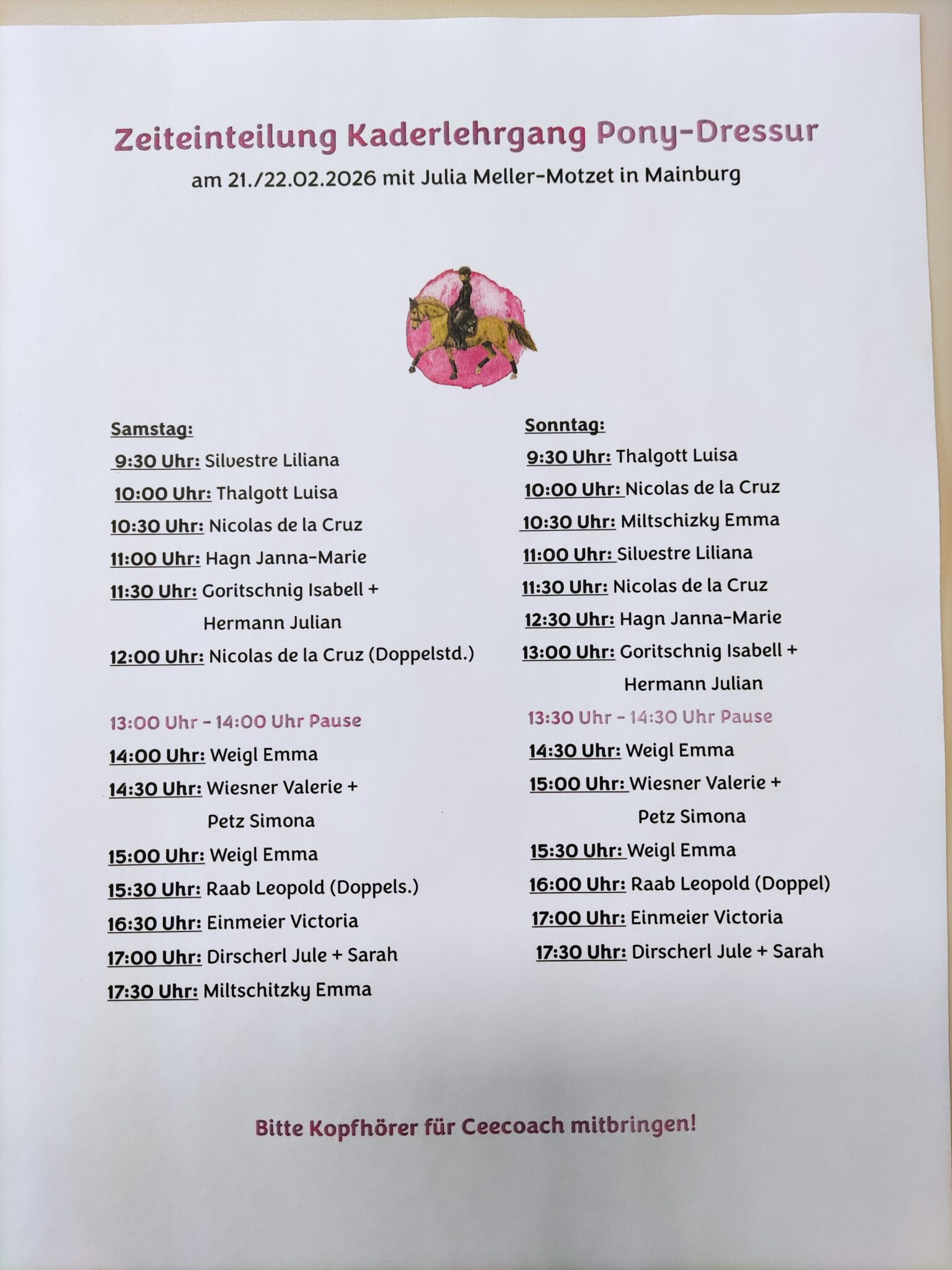 « Alle Veranstaltungen Diese Veranstaltung hat bereits stattgefunden. Kaderlehrgang Pony-Dressur in Mainburg 21. Februar 2026 - 22. Februar 2026 « Dressurlehrgang beim RC Straubing e. V. Lehrgänge beim RFV Grafenhaun e. V. » Wir wünschen allen Reiter/innen ein lehrreiches Wochenende 🍀 + Google Kalender+ Zu iCalendar hinzufügen Details Beginn: 21. Februar 2026 Ende: 22. Februar 2026 Kategorien: Allgemein, Lehrgang Veranstaltungsort Reitanlage Mainburg
