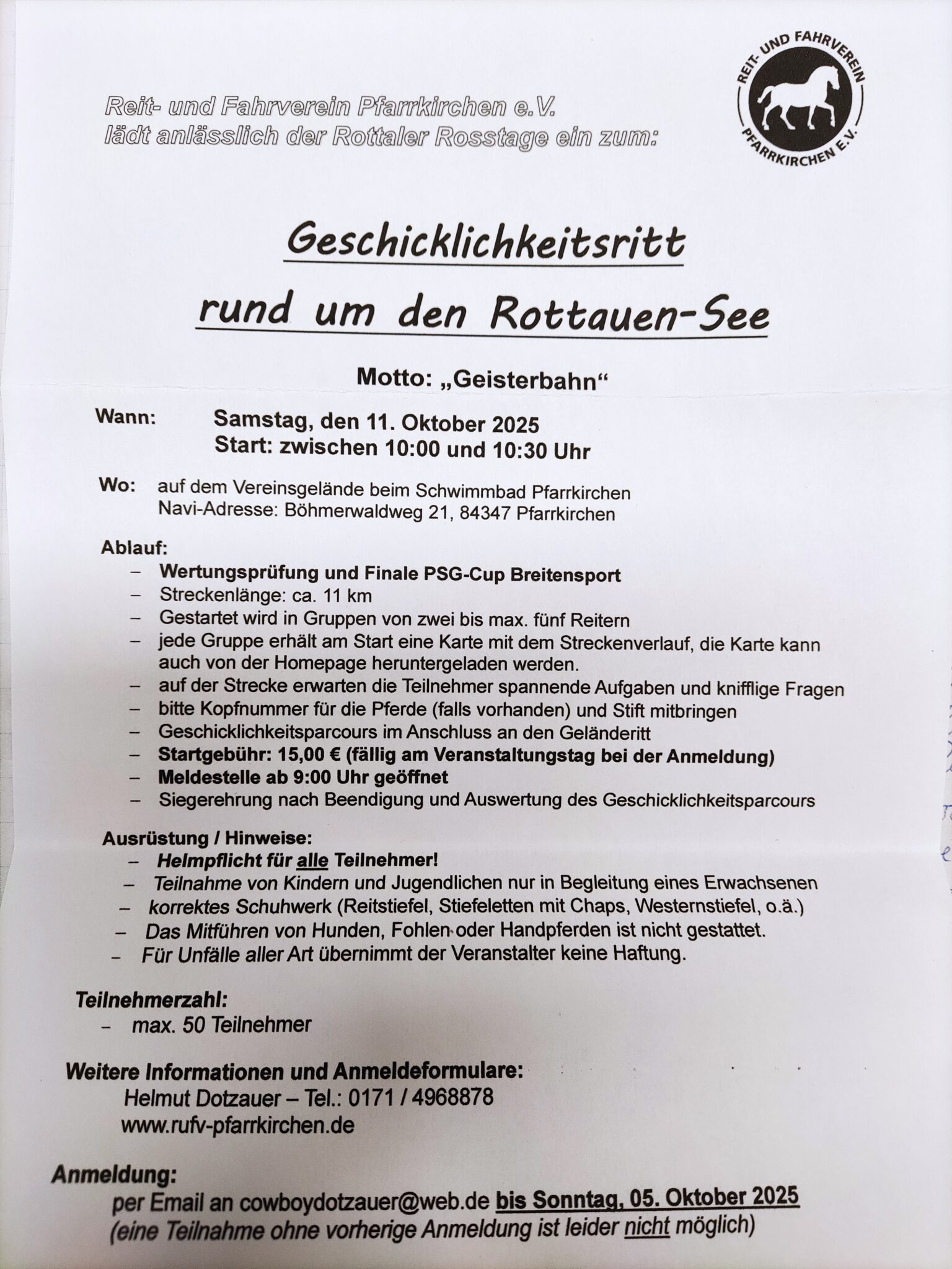 « Alle Veranstaltungen O-Ritt anlässlich der Rottaler Rosstage 11. Oktober 2025 @ 8:00 - 17:00 « O-Ritt mit PSG-Cup Breitensport bei den Pferdefreunden Eichendorf e. V. O-Ritt beim RFV St. Leonhard Adlkofen e. V. » Das Organisationsteam freut sich auf zahlreiche nette Gäste aus nah und fern 🐎🐎🐎 + Google Kalender+ Zu iCalendar hinzufügen Details Datum: 11. Oktober 2025 Zeit: 8:00 - 17:00 Kategorie: Allgemein Veranstaltungsort RuFV Pfarrkirchen e. V.