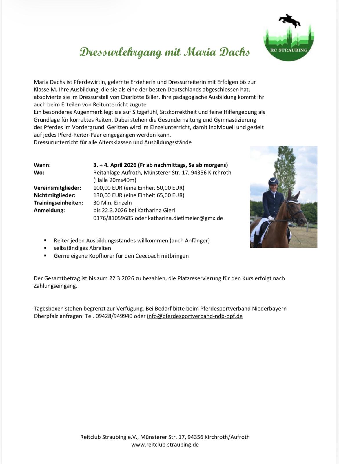 « Alle Veranstaltungen RC Straubing – Dressurlehrgang 3. April 2026 - 4. April 2026 « Geländetraining für Förderstufe und Interessierte Geländereiter Crosstrail am Etzhof » Das Organisationsteam freut sich auf zahlreiche nette Reiter aus nah und fern 💖💕💖 + Google Kalender+ Zu iCalendar hinzufügen Details Beginn: 3. April 2026 Ende: 4. April 2026 Kategorien: Allgemein, Lehrgang Veranstaltungsort RC Straubing e. V.