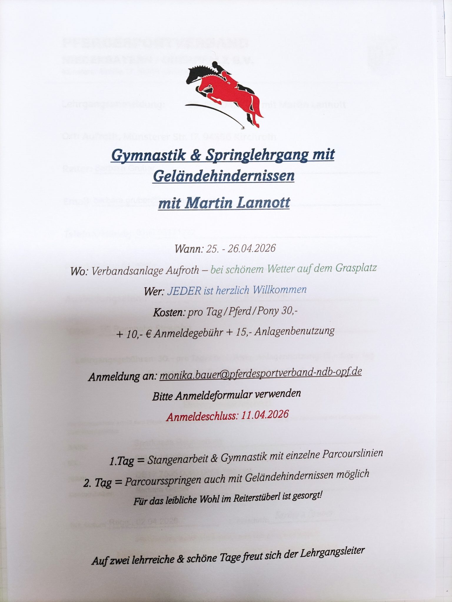 « Alle Veranstaltungen Springlehrgang mit Martin Lannott 25. April 2026 - 26. April 2026 « Geländetraining in Schwandorf/Büchelkühn gerittene und geführte GHP » Lehrgangsanmeldung – Springen 25.-26.04.2026 – M. Lannott docx + Google Kalender+ Zu iCalendar hinzufügen Details Beginn: 25. April 2026 Ende: 26. April 2026 Kategorien: Allgemein, Lehrgang Veranstaltungsort Pferdesportverband Ndb./Opf. Münsterer Straße 17/Aufroth Kirchroth, 94356 Germany Google Karte anzeigen Website: www.pferdesportverband-ndb-opf.de